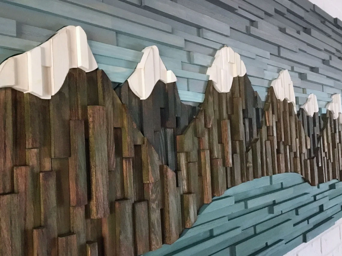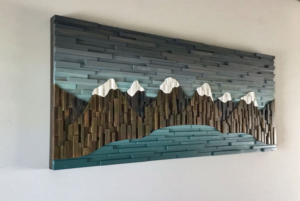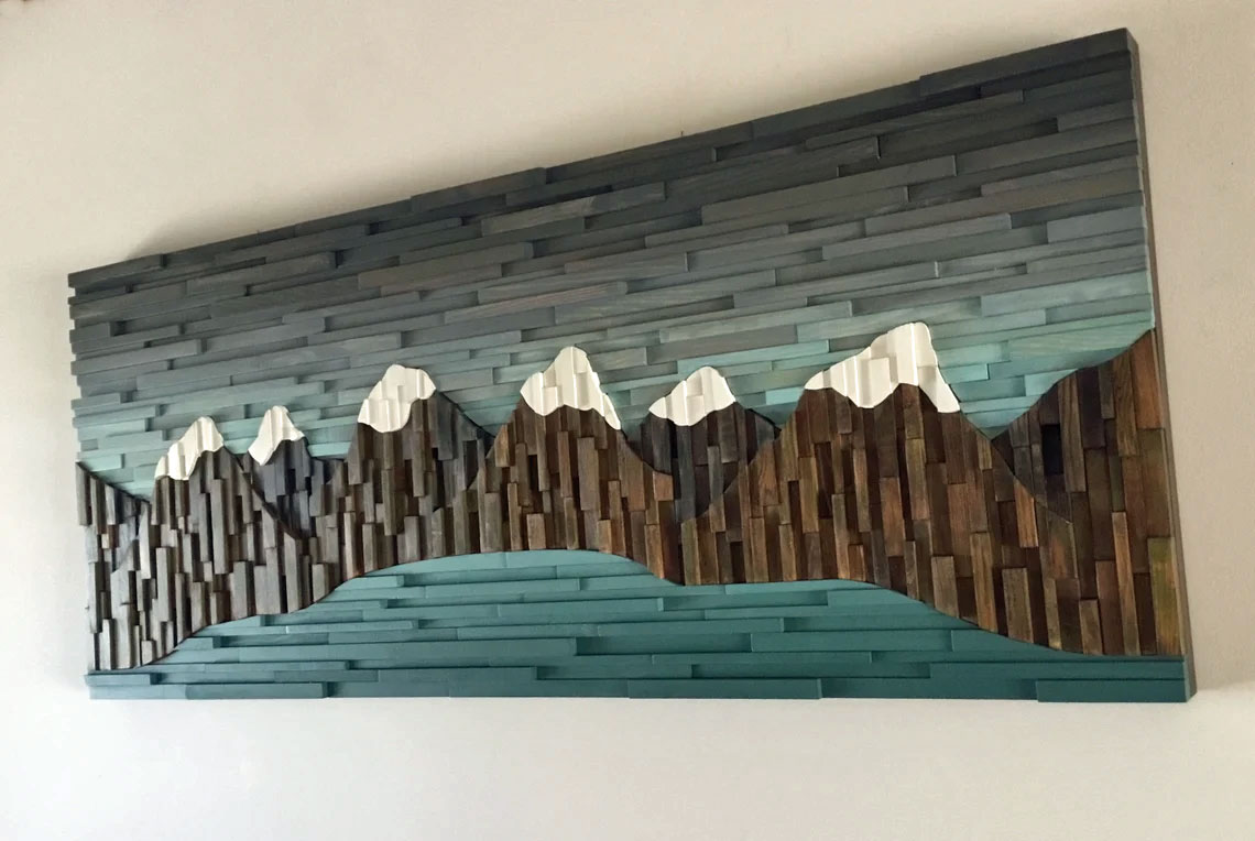 This amazing Mountain Range wood wall sculpture landscape piece is my impression to portray a realistic image of what mountains look like. This mountain landscape flows organically from one side to the other, putting some series of mountains behind others. From a distance it looks like a real photo or painting, as you get closer your eye catches the dimensional wood pieces and draws you in. The hundreds of wood pieces are strategically ripped, cut, sanded and placed in the frame in a way that adds layers of dimension on top of dimensional piece's themselves giving this piece a very dramatic, rich and textured look.