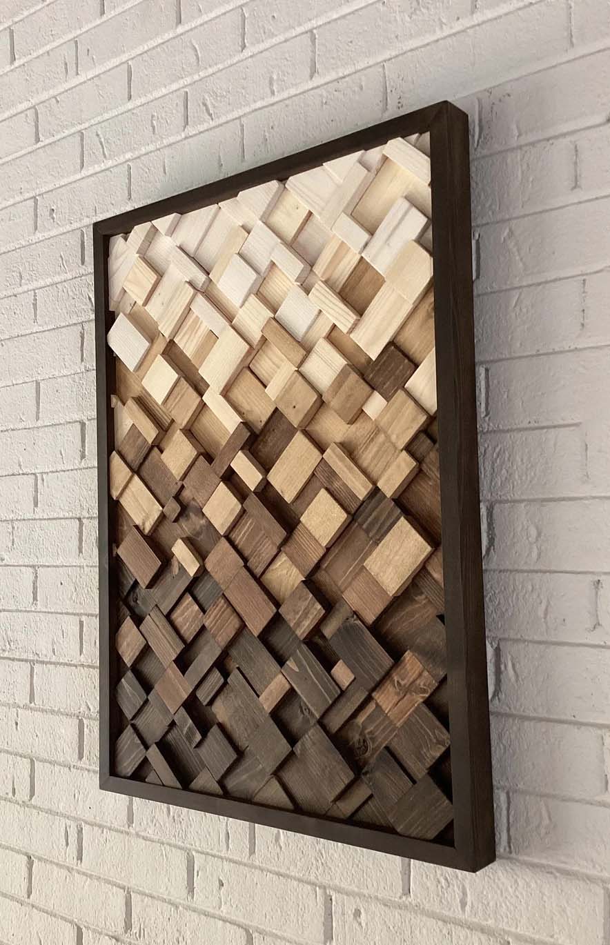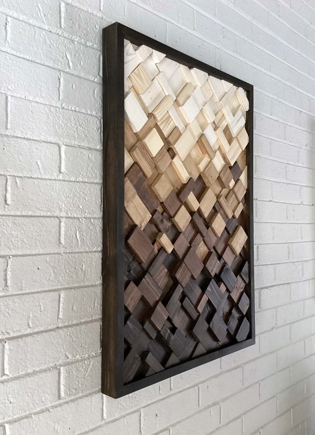 his design , which we call " Dimensional Fractioned Squares " has a nice geometric and symmetric balance and flow. With it's dark to natural gradient fading wood tones positioned in a diagonal direction, this piece is definitely pleasing to the eye. Prior to placement , the wood was ripped and cut to specific sizes, sanded, stained and arranged into it's framed design.
