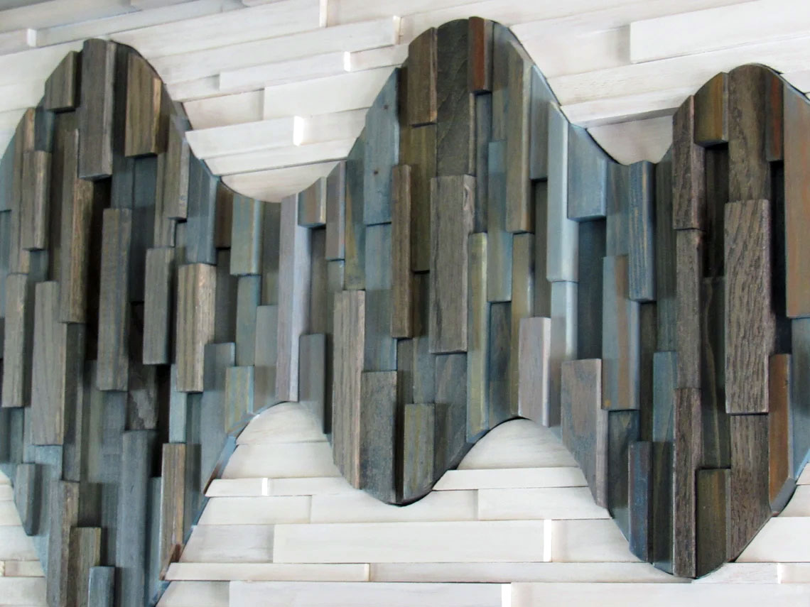 With the blue wave pieces oriented in a vertical direction, and the surrounding background pieces oriented in a horizontal direction, also custom mixed stains fading from a white center to dark gray, making this a very eye catching sculpture.